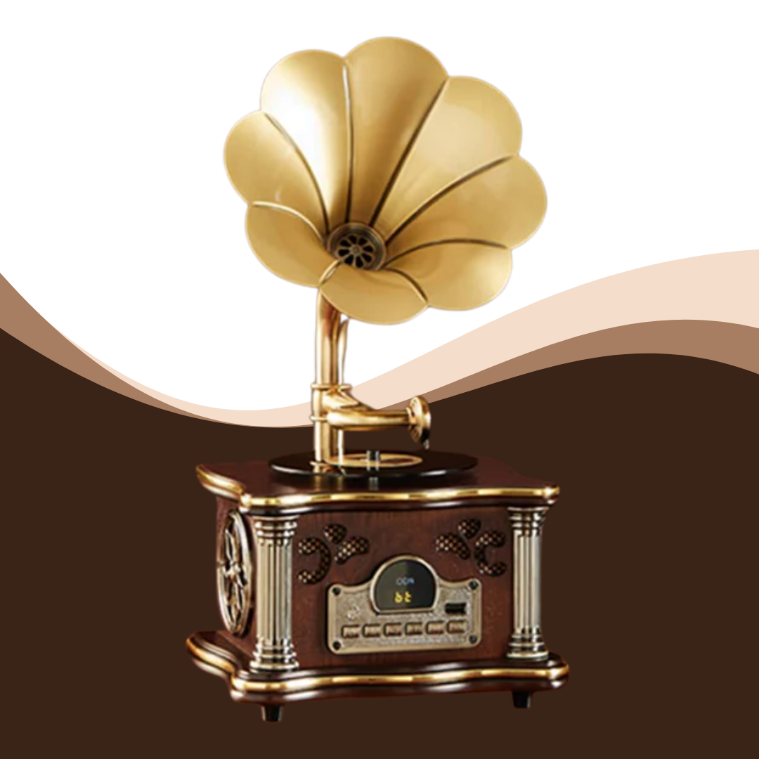 Tired of boring black boxes? This vintage speaker adds charm and crystal-clear music. Real wood, gold horn, turn your home into a vibe.