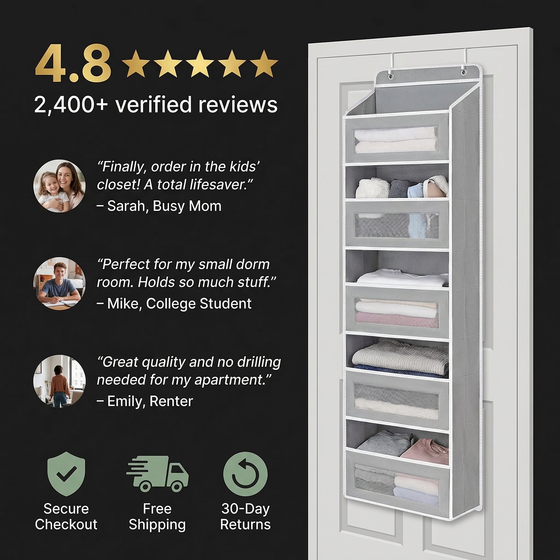Installed in SecondsTwo hooks, any door. You are done. No tools, no damage, no waiting.