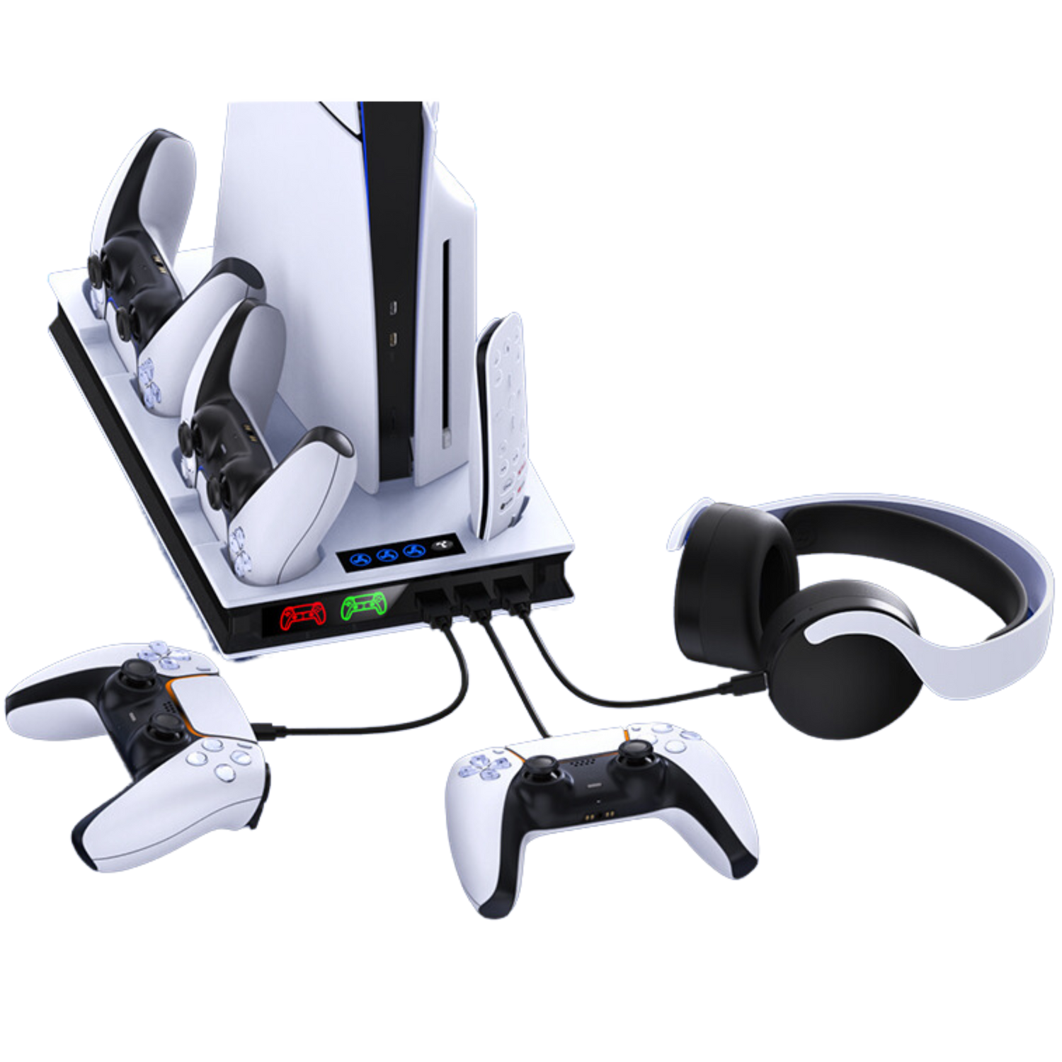 Features three extra USB hubs for charging devices like a mouse, keyboard, or headset. Saves space and keeps your PS5 accessories organized, including the console, two DualSense controllers, headset, and media remote.