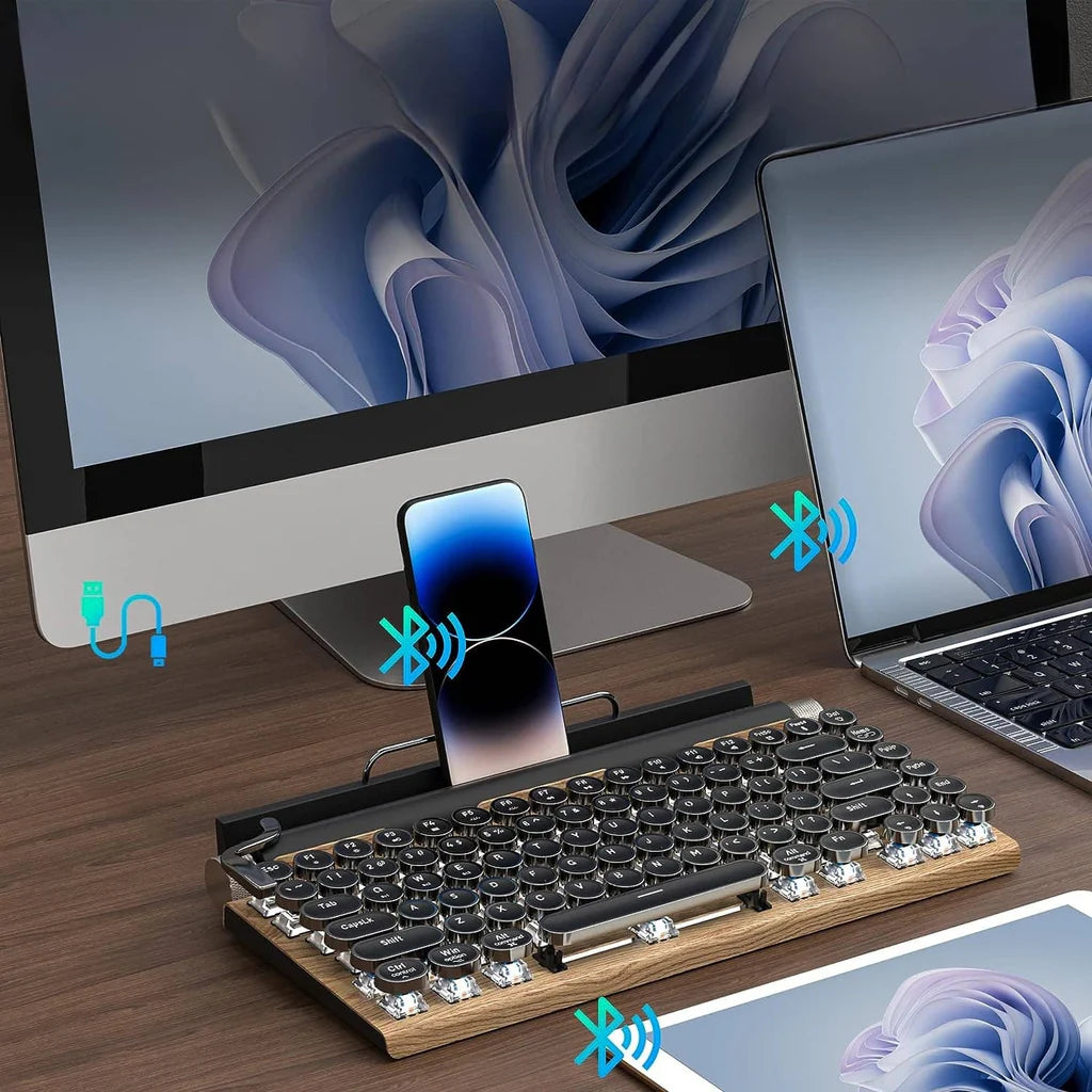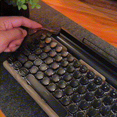 Indulge in elegance with our typewriter keyboard. The polished metal rod adjusts backlight, the refined metal revolver controls brightness, and the sleek metal wheel adjusts volume.